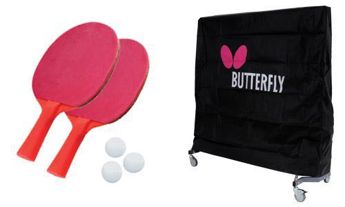 2 x reverse sponge bats, 3 x white balls and a cover.